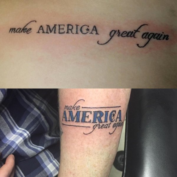 CZ2h9EJUMAE3Jij Published February 1, 2016 at 600 × 600 in Tattoo Artist Offering Free Donald Trump Tattoos ← Previous Next → Trump slogan tattoos by Bob Holmes. [Photo: NH1]
